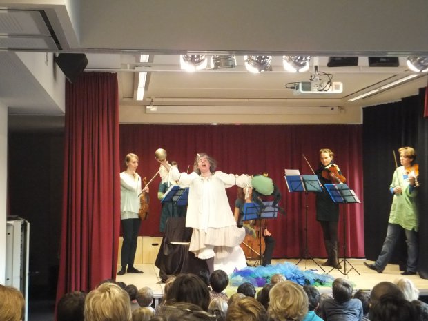 Eine besondere Idee war die sorgfältige und kenntnisreiche Auswahl von Kompositionen des Barock, ebenso sorgfältig und mit theatralischer Akzentuierung von sechs Musikerinnen und einem Musiker gespielt. Die Musik erhöhte den poetischen Gehalt der einzelnen Bilder des Märchens und hob den Sinn der Musik für Szene hervor.